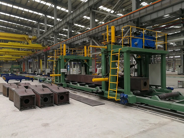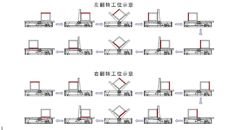 Ühel küljel keevitatud töötükkide ümberlülitamiseks kasutatakse kahte mobiilset 180 ° hüdrauliliste talade klambrit. Töötades tõstke töötükk rullikulaualt või töötükist eemal ning reduktor sõidab kaks tala klapp, et liikuda sünkroonselt, et viia töötükk rulllaua küljele või töötükiregisti küljele, ja seejärel kaks hüdrauliliset silindrit sõidavad kaks kätt sünkroonselt pöörlevasse töölauale ja töökese keskosale, millele järgmine tööviske keskosasse pöördub